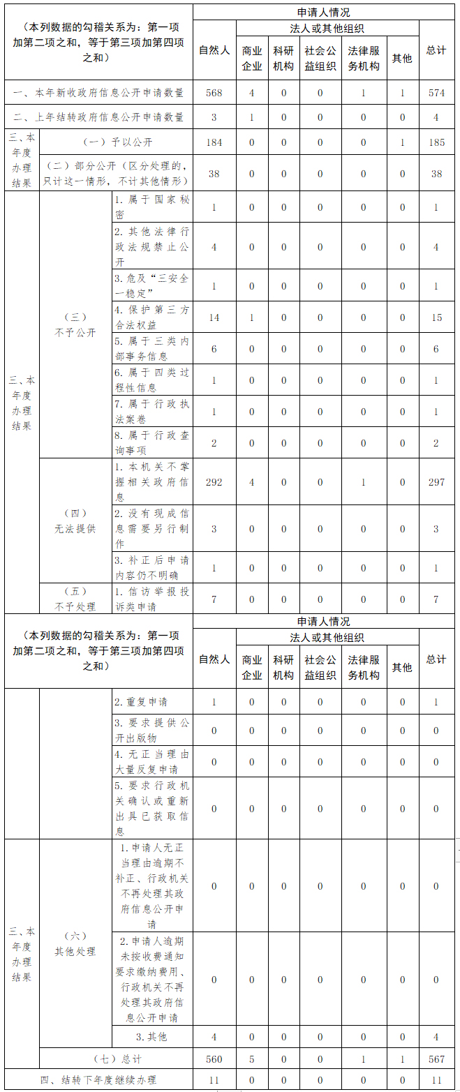 (二)依申请公开方面。坚持依法依规做好政府信息依申请公开工作,全市各级各部门2025年度共新收政府信息公开申请574件;办理567件(含上年度结转3件),其中自然人申请560件,占比98.7%,法人或其他组织申请7件,占比1.3%,均在法定期限内予以答复。本年度办理结果中,予以公开185件、部分公开38件、不予公开31件、因本机关不掌握等原因无法提供301件、信访举报投诉等不予处理8件,逾期未补正等其他处理4件。政府信息公开类行政复议72件,未经复议直接起诉0件,复议后起诉13件。