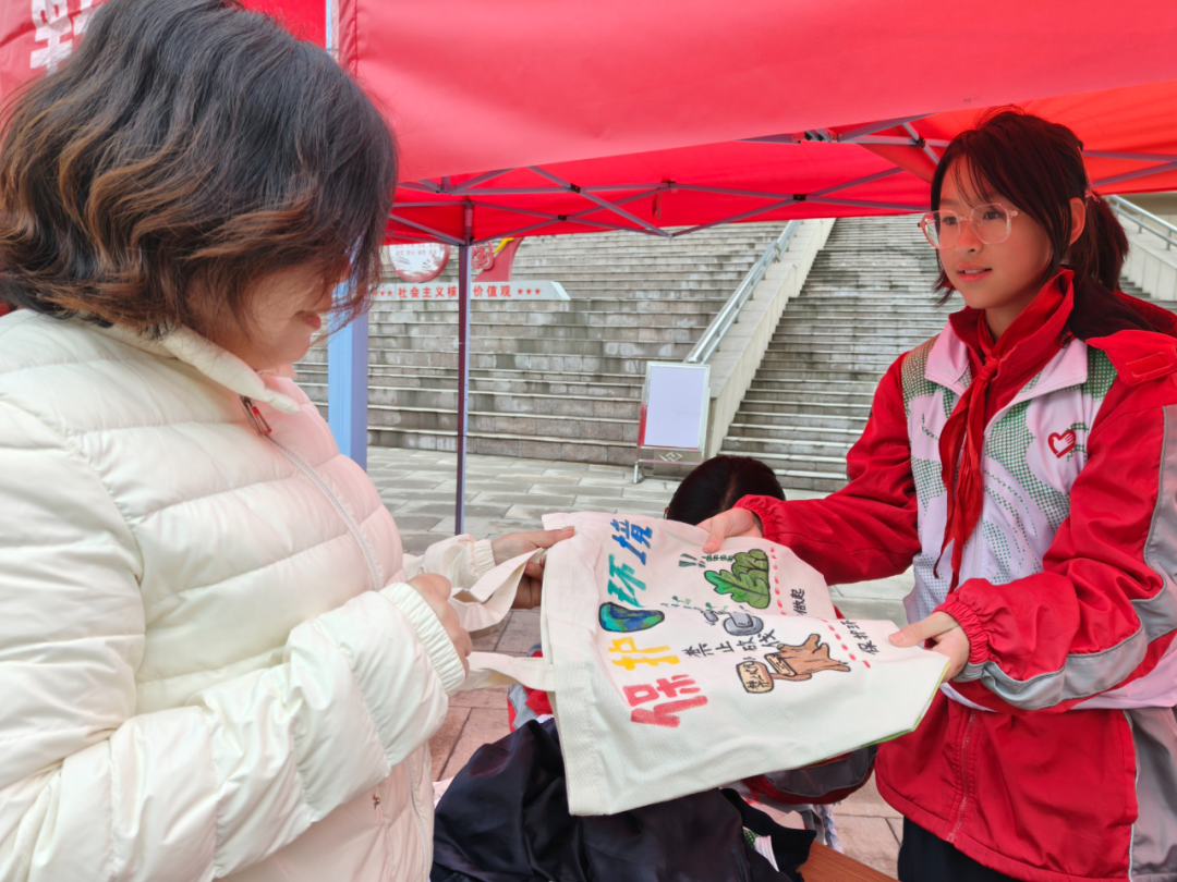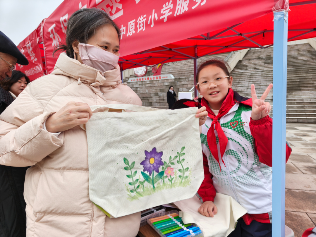 活动现场,孩子们手持画笔,在环保袋上尽情挥洒创意,将对绿色家园的向往跃然袋上。绘制好成品后,同学们主动将亲手创作的环保袋赠予过往居民,用实际行动倡导使用环保购物袋、践行低碳环保理念,让雷锋精神在春日里生根发芽、传递芬芳。