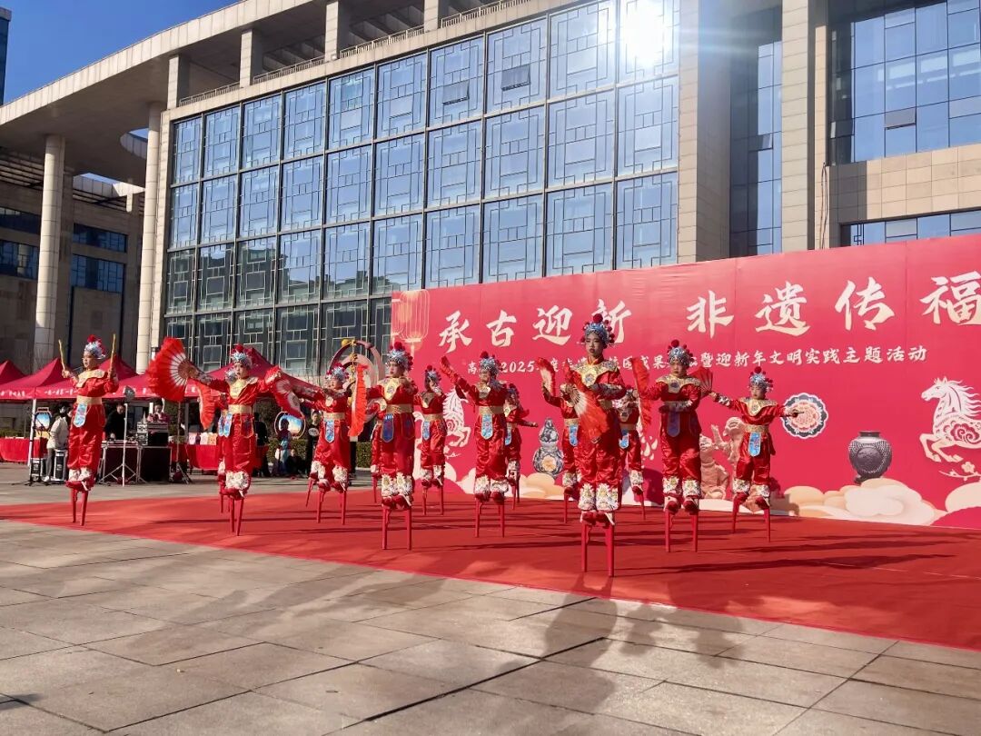 非遗高跷传承人王太平老师指导高平八中学生在高平新时代文明实践中心广场表演