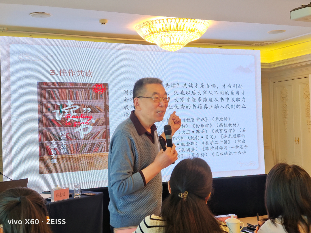 南通市名师培养导师团副团长郭志明以《走向“国字号”,创意“引未来”》为题,分享了工作室深耕的九大共生路径:思政共攀、课堂共优、活动共进、融通共新、错位共生等,又从策应时代、课题引领、跨界融合、数智赋能等方面提供策略指导,最终向“被研究”的高度迈进,加深了大家对名师工作室内涵发展的认知。
