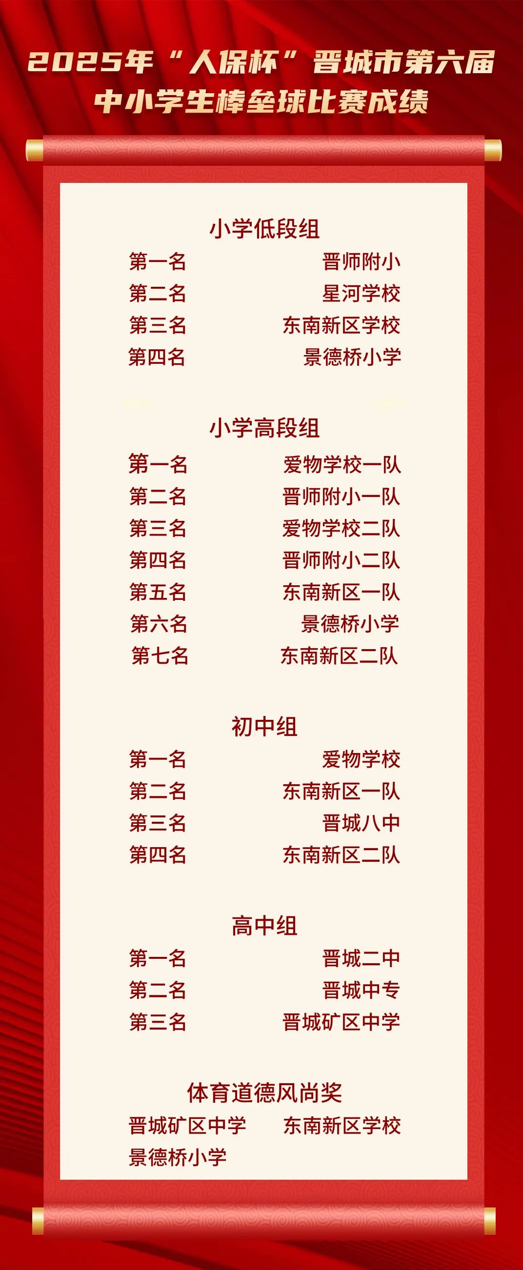 在3天的比赛中,棒垒球小将们充分发挥了团结协作、敢于拼搏的精神,在赛场上挥洒汗水、奋力奔跑,通过一系列智慧判断、精准出击、点燃赛场激情。经过激烈的比拼,最终,晋城二中荣获高中组冠军、爱物学校荣获初中组、小学高段组冠军,晋师附小荣获小学低段组冠军。