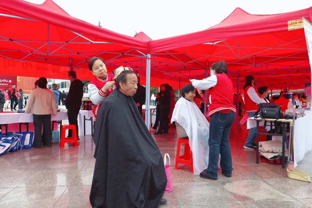 ▲志愿者为老人提供免费理发服务