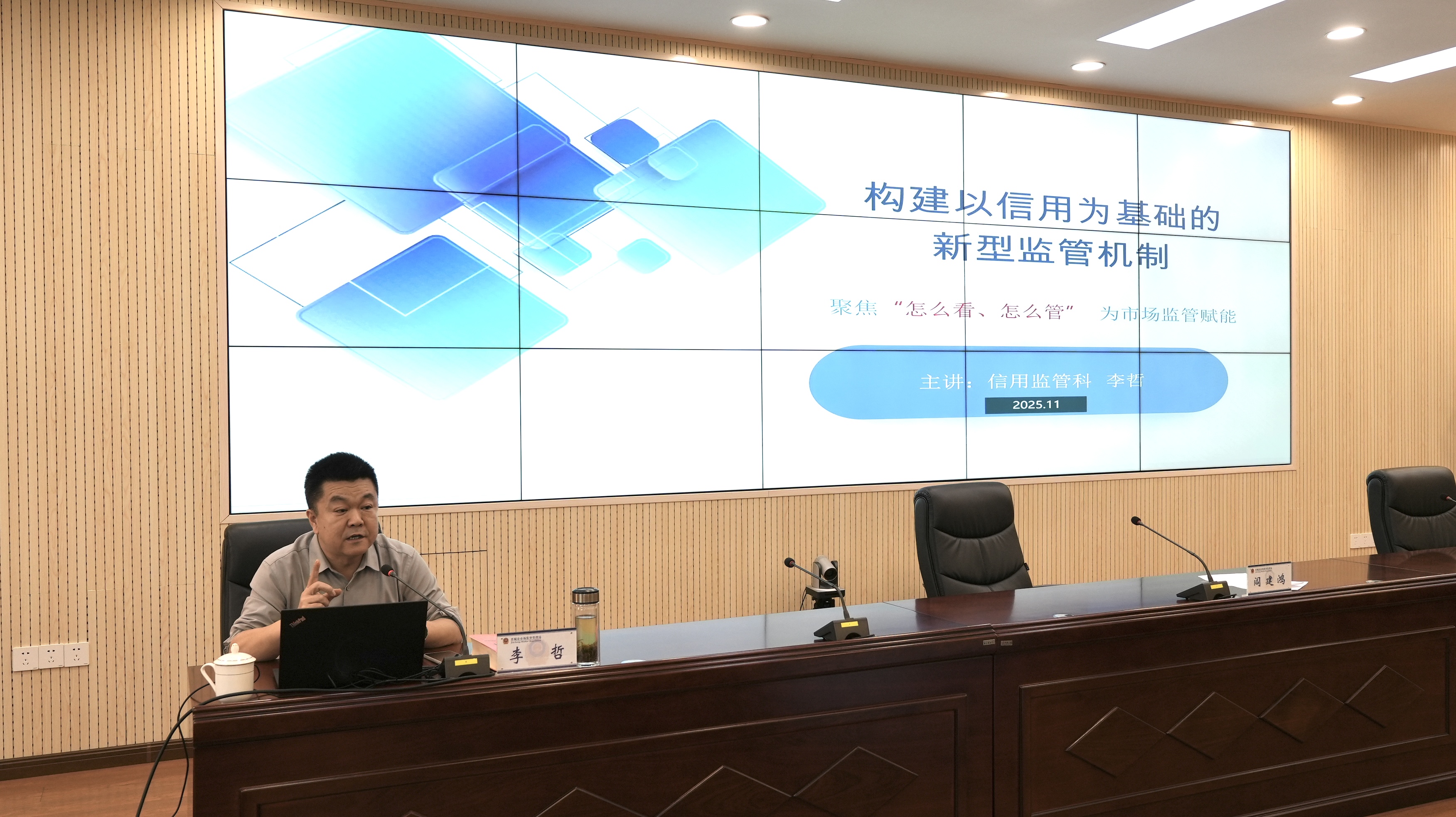 11月14日,市市场监管局举办第八期“市场监管·半月谈”,市局信用监管科科长李哲围绕“构建以信用为基础的新型监管机制”分享了自己的工作经验。市局二级调研员阎建鸿主持活动,市局机关及部分下属事业单位在主会场参会,开发区分局、市市场监管综合行政执法队通过视频连线在各分会场同步学习。
