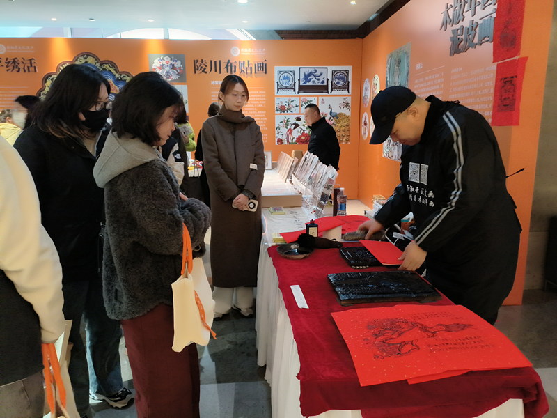 金色大厅外,别开生面的晋城非遗展示正如火如荼地进行着,这里汇聚了晋城地区独有的非遗技艺与精美作品,成为了整场活动的亮点之一。从灵动飘逸的高平剪纸、细腻精巧的高平绣活到绚丽多彩的陵川布贴画、古朴纯真的泥皮画,来自晋城的非遗传承人为学子们奉上一场视觉与文化的盛宴。浙大学子们纷纷驻足欣赏,拍照留念,对晋城非遗文化表示出了浓厚兴趣。