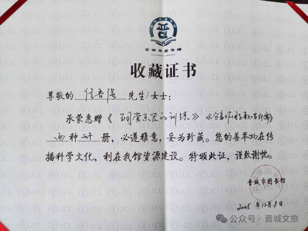 对于这份沉甸甸的“乡情”,晋城市图书馆郑重地颁发了收藏证书,并将这些珍贵的地方文献妥善珍藏。