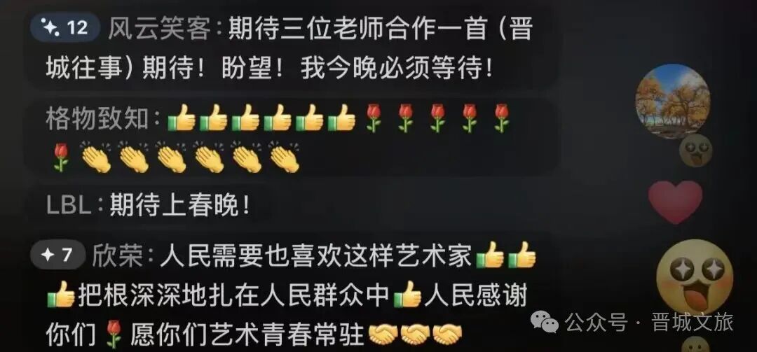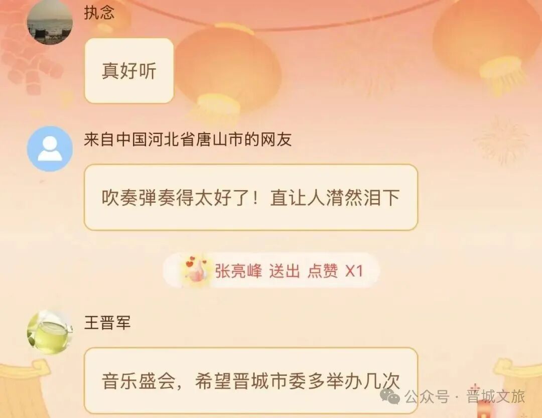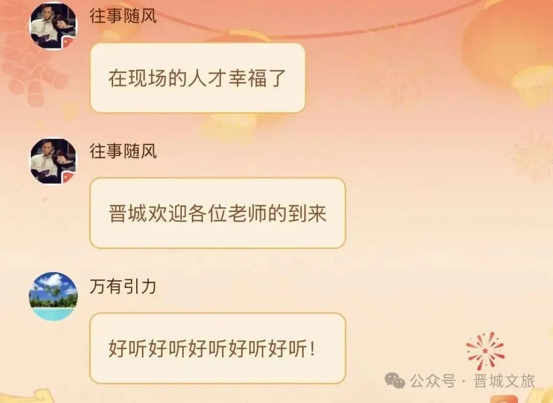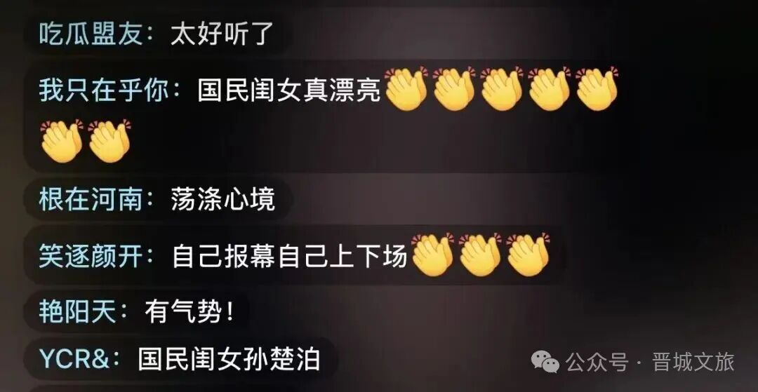 “我是孙楚泊老师的铁杆粉丝,这次知道她在晋城演出,专门从吕梁过来看的。没想到还是免费的,给我们晋城文旅点个赞!这次来其实最想听的就是《晋城往事》,听完之后的感受就是我跑这趟值了,是一种心灵上的享受!包括这次我也是第一次来晋城,感觉城市很干净,给人的感觉很舒服,之后有机会一定要再来看看!”
