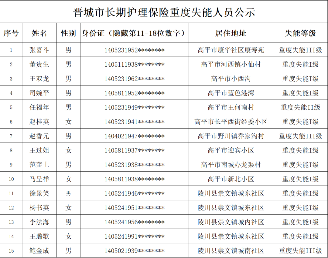 根据《长期护理失能等级评估标准(试行)》《晋城市长期护理保险失能评定管理办法(试行)》规定,经评定,张喜斗、董贵生等15位同志符合重度失能标准,现予以公示。