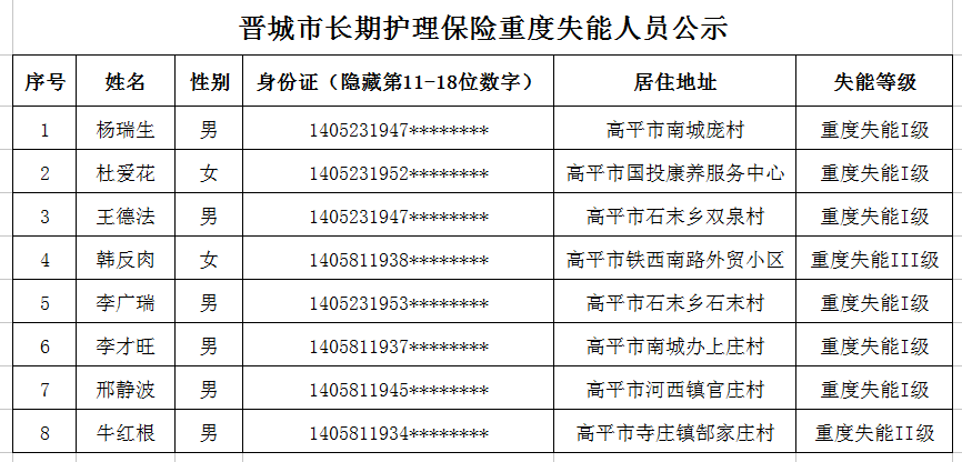 根据《长期护理失能等级评估标准(试行)》《晋城市长期护理保险失能评定管理办法(试行)》规定,经评定杨瑞生、杜爱花等8位同志符合重度失能标准,现予以公示。