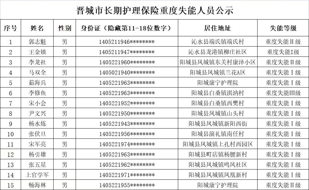 根据《长期护理失能等级评估标准(试行)》《晋城市长期护理保险失能评定管理办法(试行)》规定,经评定,郭志魁、王金锁等15位同志符合重度失能标准,现予以公示。