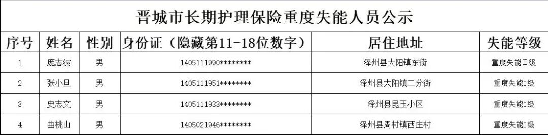 根据《长期护理失能等级评估标准(试行)》《晋城市长期护理保险失能评定管理办法(试行)》规定,经评定,庞志波、张小旦等4位同志符合重度失能标准,现予以公示。