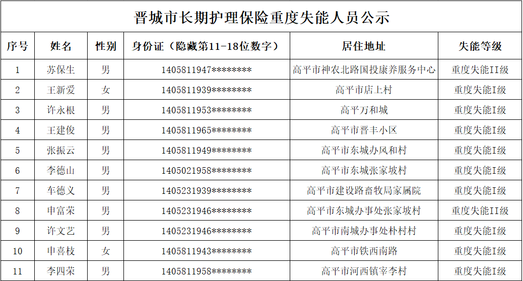 根据《长期护理失能等级评估标准(试行)》《晋城市长期护理保险失能评定管理办法(试行)》规定,经评定,苏保生、王新爱等11位同志符合重度失能标准,现予以公示。