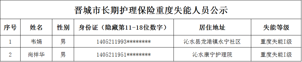 根据《长期护理失能等级评估标准(试行)》《晋城市长期护理保险失能评定管理办法(试行)》规定,经评定,韦娟、尚祥华2位同志符合重度失能标准,现予以公示。