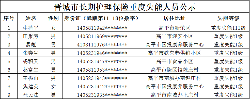 根据《长期护理失能等级评估标准(试行)》《晋城市长期护理保险失能评定管理办法(试行)》规定,经评定,牛荷平、田秉芳等9位同志符合重度失能标准,现予以公示。
