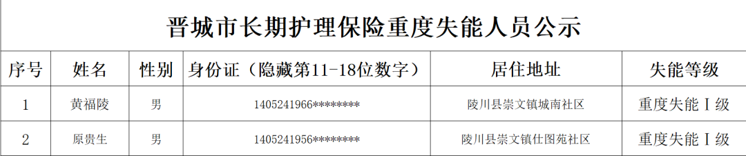 根据《长期护理失能等级评估标准(试行)》《晋城市长期护理保险失能评定管理办法(试行)》规定,经评定,黄福陵、原贵生两位同志符合重度失能标准,现予以公示。