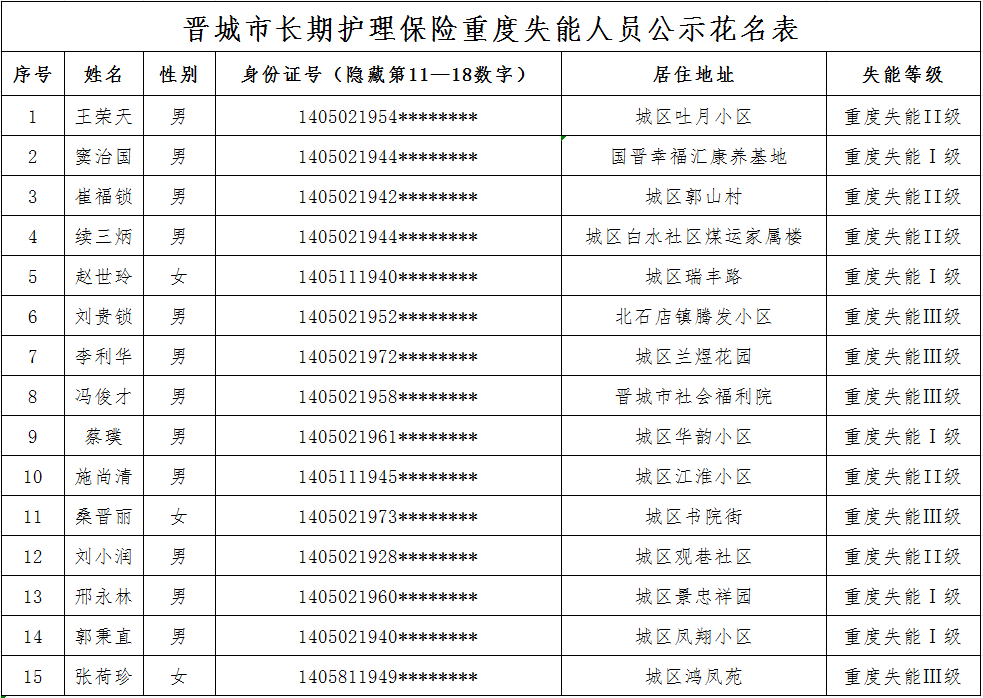 根据《长期护理失能等级评估标准(试行)》《晋城市长期护理保险失能评定管理办法(试行)》规定,经评定,王荣天、窦治国等15位同志符合重度失能标准,现予以公示(详见附表)。