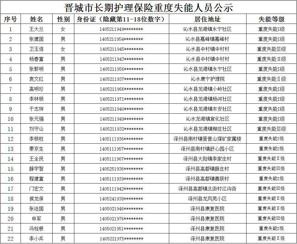 根据《长期护理失能等级评估标准(试行)》《晋城市长期护理保险失能评定管理办法(试行)》规定,经评定,王大兰、张建国等22位同志符合重度失能标准,现予以公示。