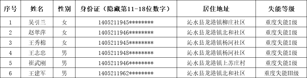 根据《长期护理失能等级评估标准(试行)》《晋城市长期护理保险失能评定管理办法(试行)》规定,经评定,吴引兰、赵翠萍等6位同志符合重度失能标准,现予以公示。