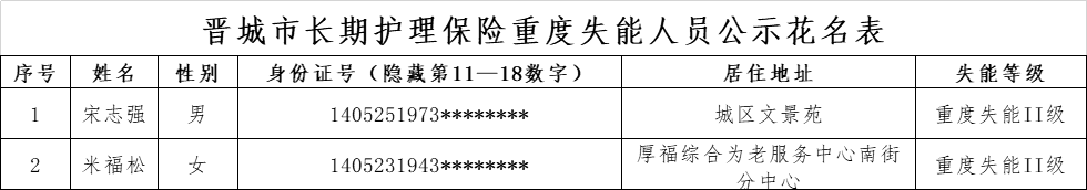 根据《长期护理失能等级评估标准(试行)》《晋城市长期护理保险失能评定管理办法(试行)》规定,经评定,宋志强、米福松2位同志符合重度失能标准,现予以公示(详见附表)。