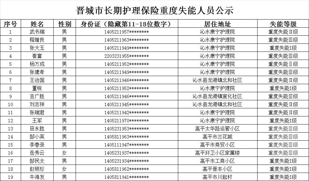 根据《长期护理失能等级评估标准(试行)》《晋城市长期护理保险失能评定管理办法(试行)》规定,经评定,武书瑞、程增良等19位符合重度失能标准,现予以公示。