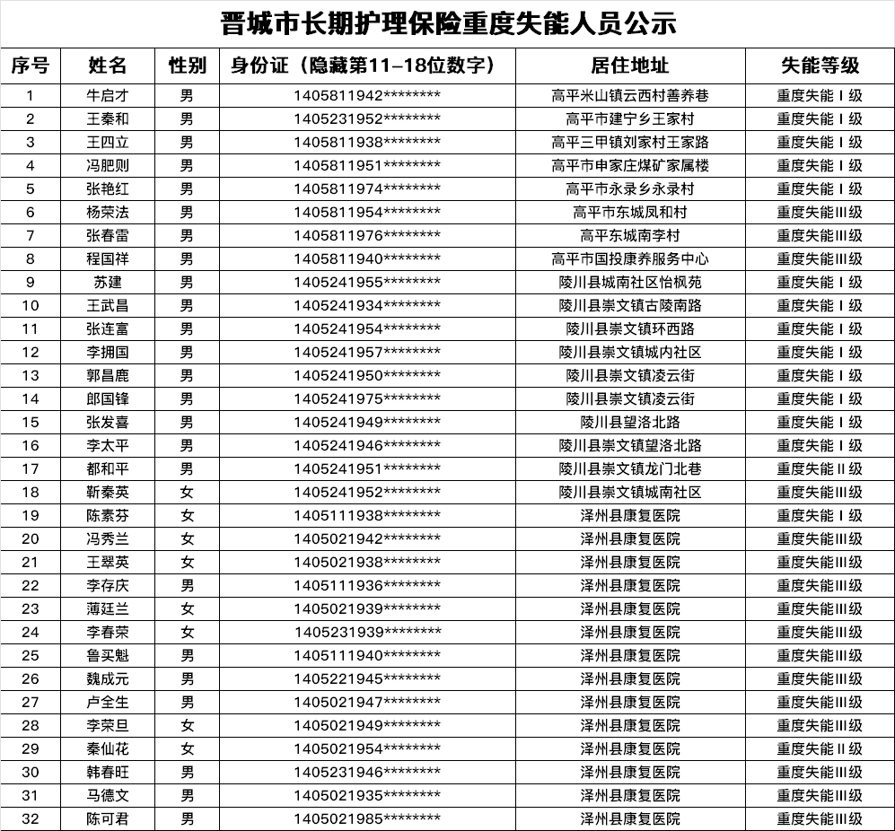 根据《长期护理失能等级评估标准(试行)》《晋城市长期护理保险失能评定管理办法(试行)》规定,经评定牛启才、王秦和等32位同志符合重度失能标准,现予以公示。