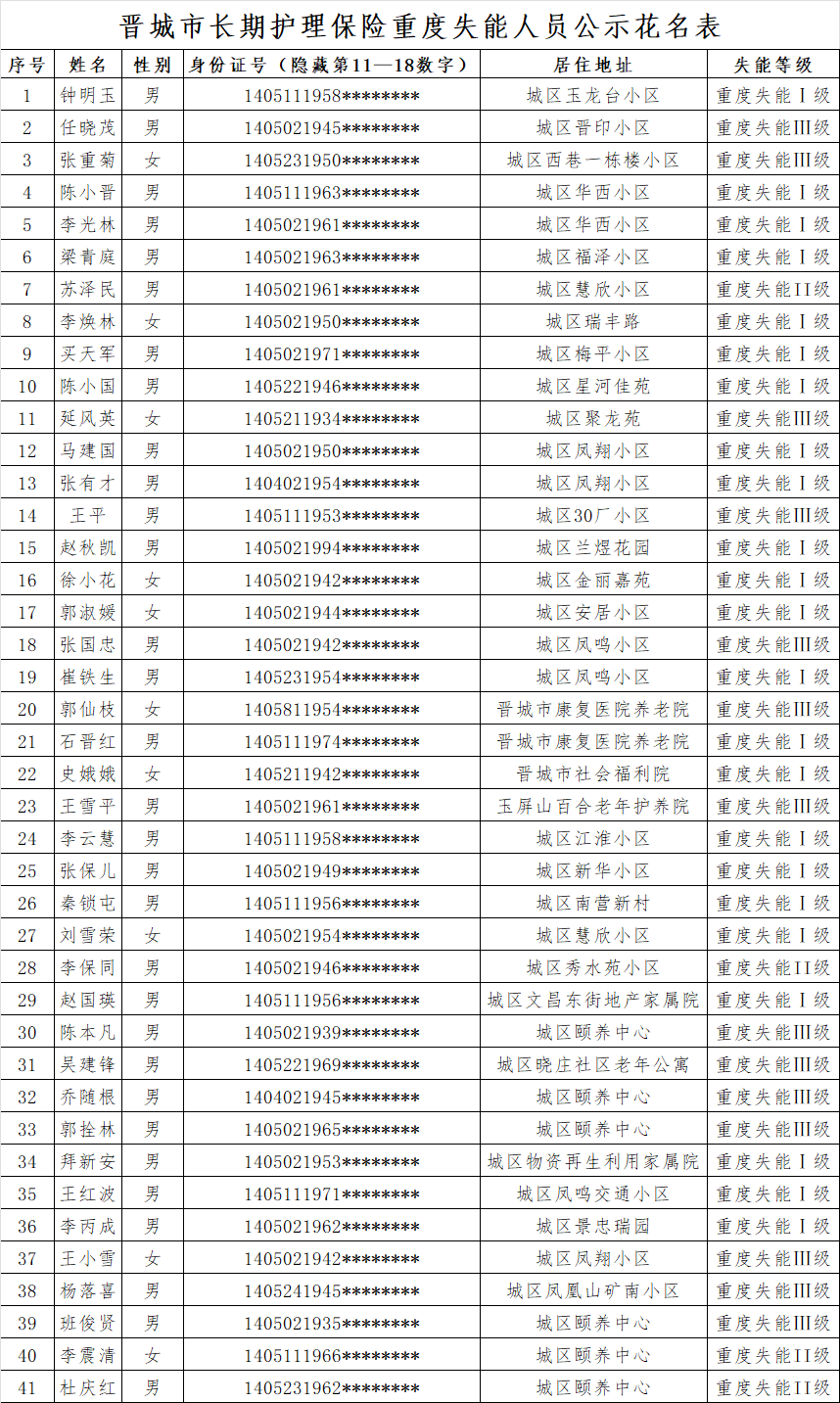 根据《长期护理失能等级评估标准(试行)》《晋城市长期护理保险失能评定管理办法(试行)》规定,经评定,钟明玉、任晓茂等41位同志符合重度失能标准,现予以公示。