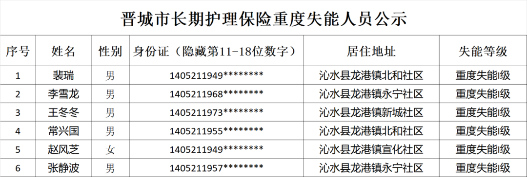 根据《长期护理失能等级评估标准(试行)》《晋城市长期护理保险失能评定管理办法(试行)》规定,经评定裴瑞、李雪龙等6位同志符合重度失能标准,现予以公示。
