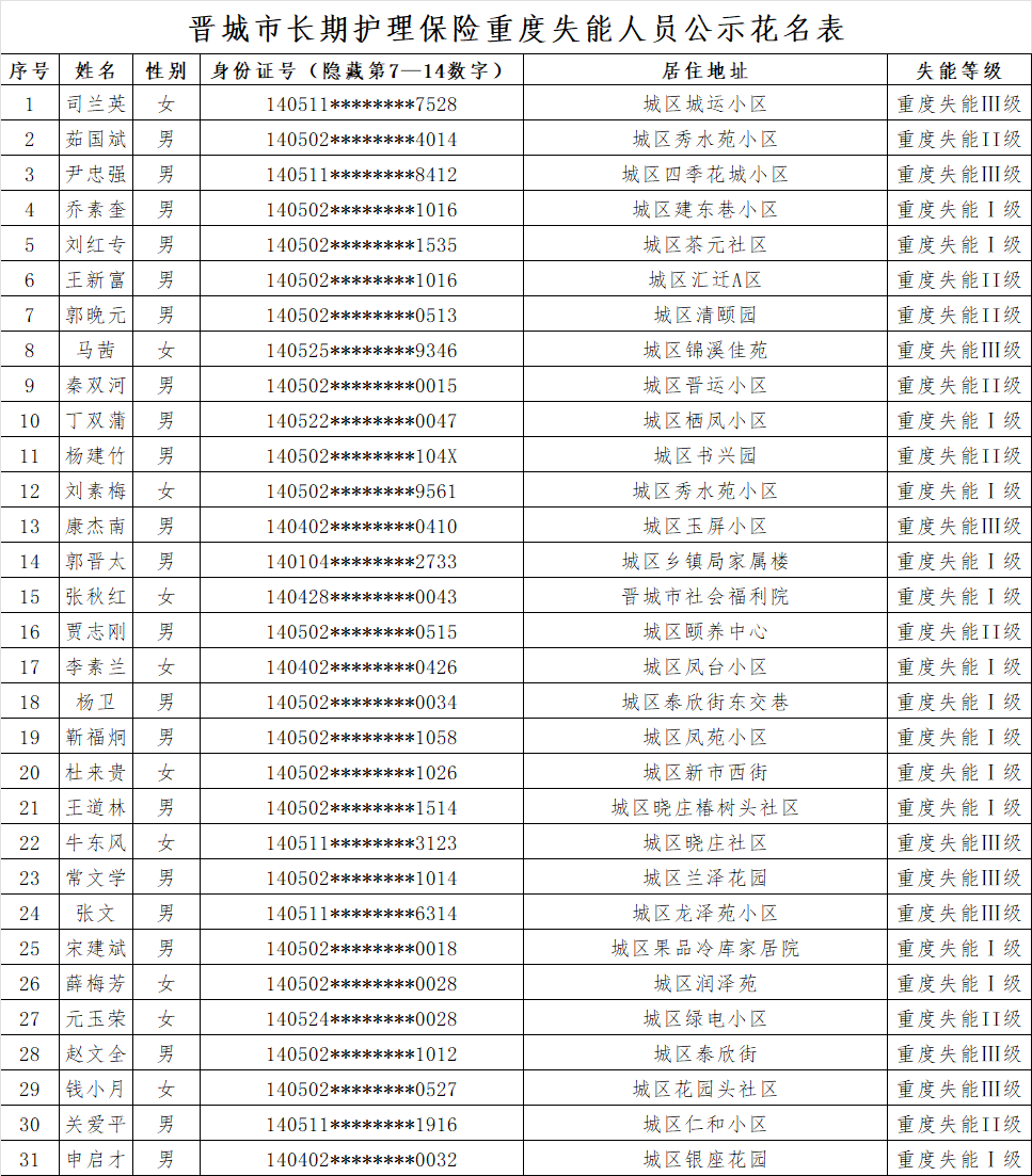 根据《长期护理失能等级评估标准(试行)》《晋城市长期护理保险失能评定管理办法(试行)》规定,经评定,司兰英、茹国斌等31位同志符合重度失能标准,现予以公示。