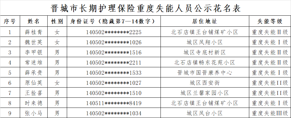 根据《长期护理失能等级评估标准(试行)》《晋城市长期护理保险失能评定管理办法(试行)》规定,经评定,薛桂青、魏世英等9位同志符合重度失能标准,现予以公示。
