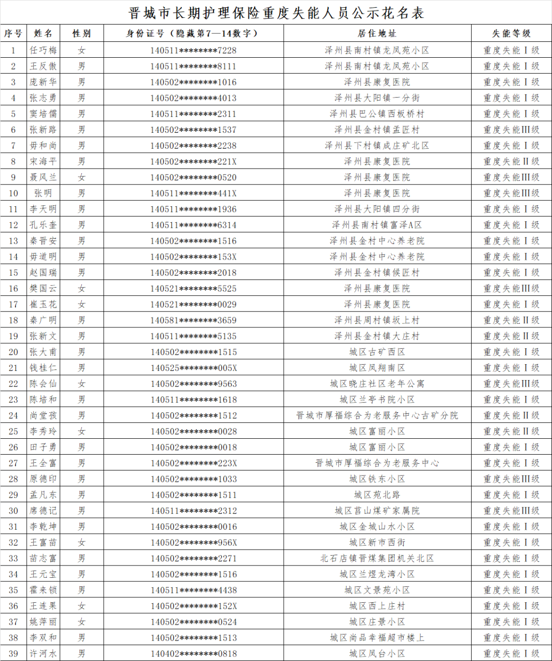 根据《长期护理失能等级评估标准(试行)》《晋城市长期护理保险失能评定管理办法(试行)》规定,经评定,任巧梅、王反傲等39位同志符合重度失能标准,现予以公示。