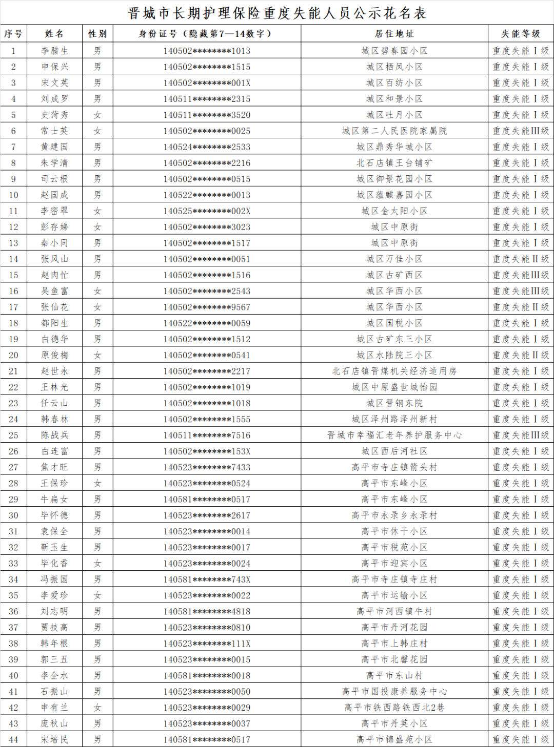 根据《长期护理失能等级评估标准(试行)》《晋城市长期护理保险失能评定管理办法(试行)》规定,经评定,李腊生、申保兴等44位同志符合重度失能标准,现予以公示。