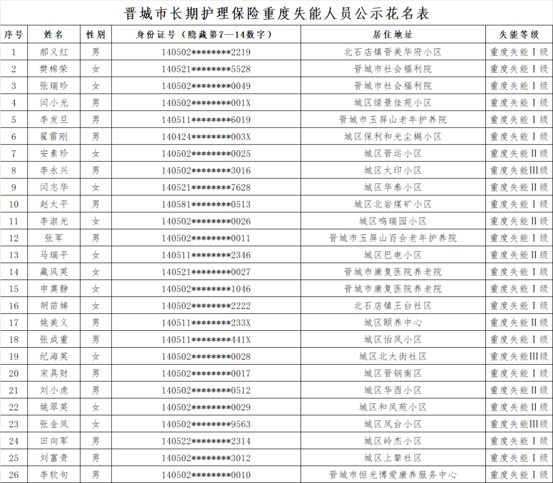 根据《长期护理失能等级评估标准(试行)》《晋城市长期护理保险失能评定管理办法(试行)》规定,经评定,郝义红、樊棉荣等26位同志符合重度失能标准,现予以公示。