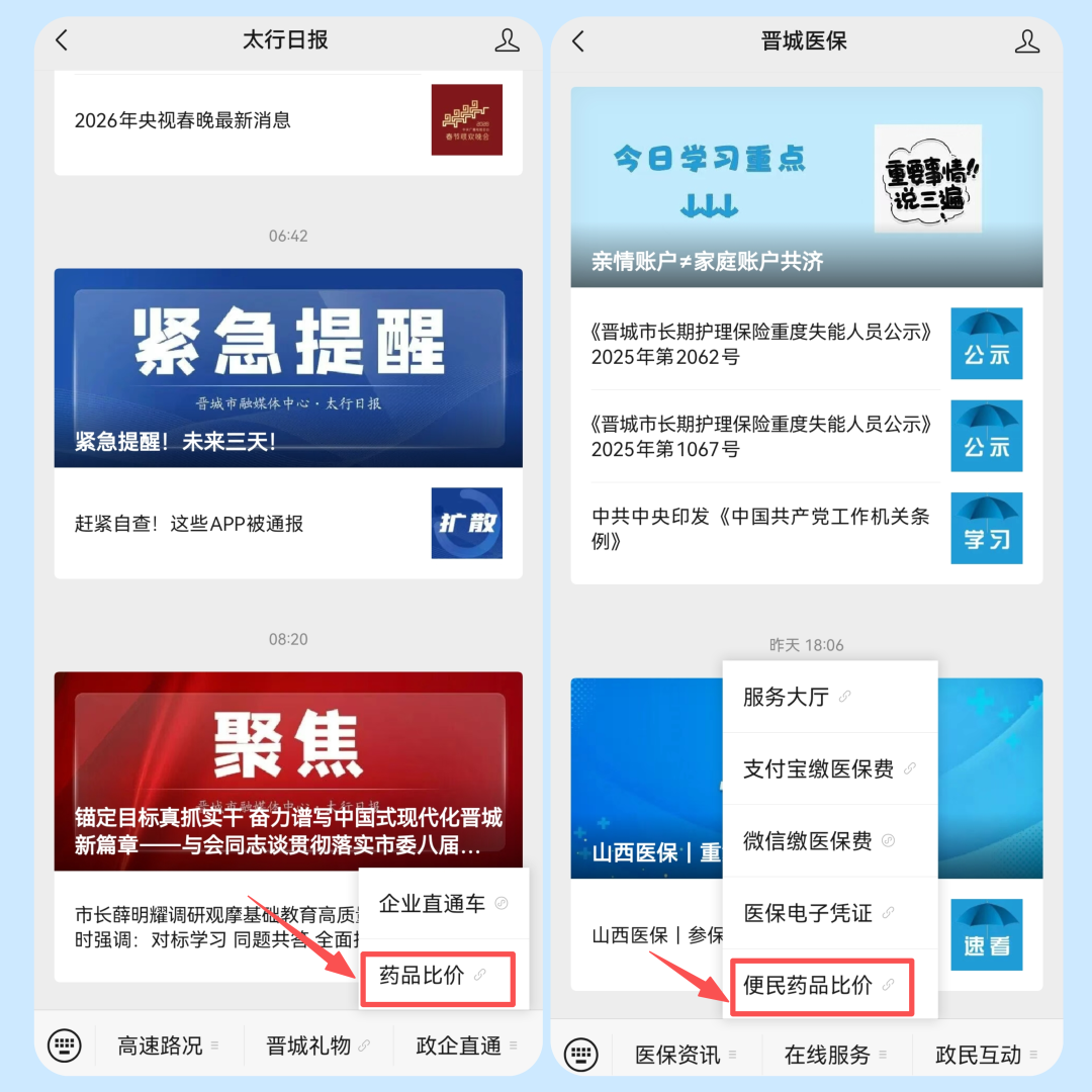 登录“晋城医保”微信公众号,点击在线服务→便民药品比价即可进入,或通过"太行日报"微信公众号,菜单项政企直通→药品比价进入。