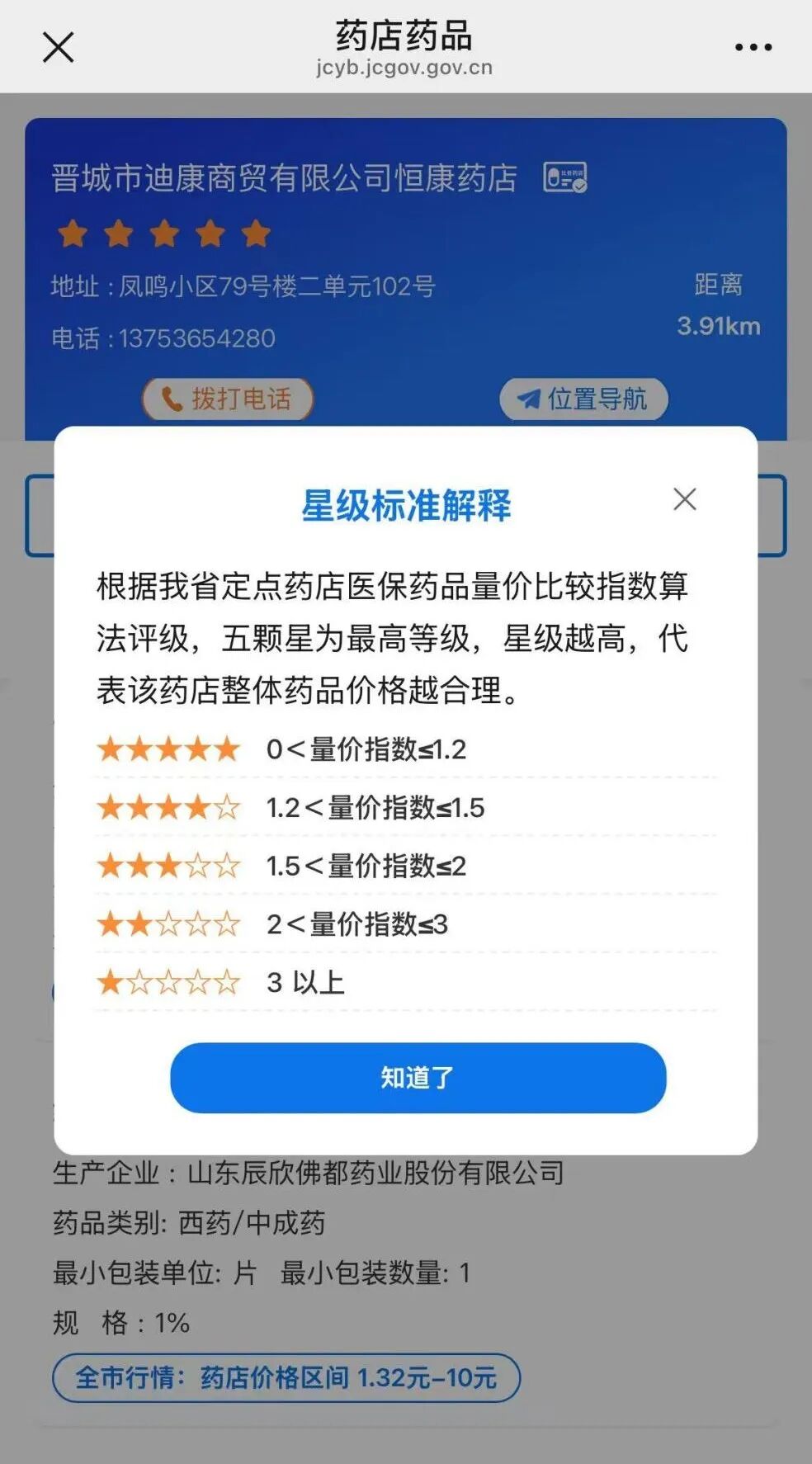量价指数(反映定点药店医保药品整体价格是否合理)星级公开,透明药店药品定价诚信级别。星级越高代表该药店整体药品价格越合理。