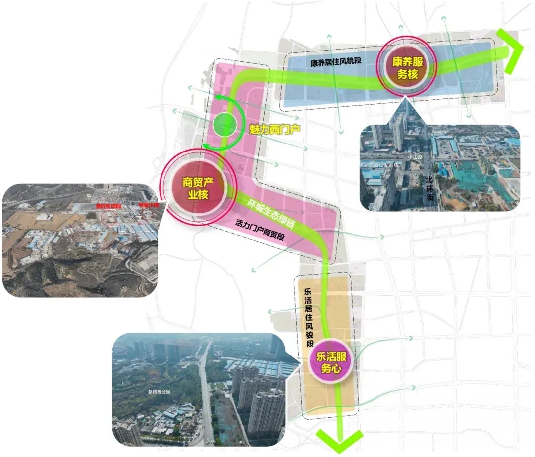 群众对宜居环境与完善配套的热切期盼,在改造蓝图中得到清晰回应。未来的西北环将呈现“一带三核心,三段优生态”的崭新图景。“一带”即沿快速内环铺展的环城生态绿链,以“绿链串珠,绿廊渗透”的理念串联风景,街角公园点缀其间,陈秀兰们将不再为无处遛弯而发愁。“三核心”包括康养服务核心、商贸产业核心、乐活服务核心。“三段”则各具特色:北部的康养居住风貌段依托凤城康养示范区,发展健康疗养、都市文娱、康养农旅;活力门户商贸段毗邻西高速口,立足商贸物流基础,发展现代商贸与智慧物流;乐活居住风貌段则借力吴王山、赵树理公园生态资源,打造运动休闲生活区。赵帅的家门口,未来不仅环境惬意舒适,更将被蓬勃发展的现代产业所环绕。