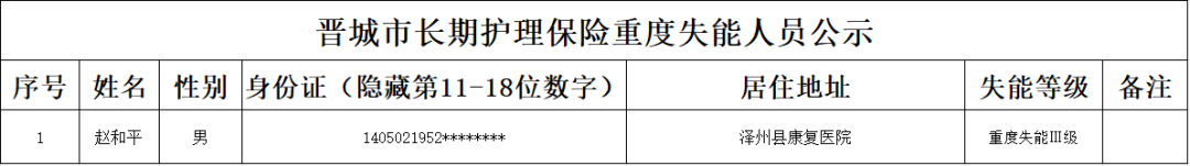 根据《长期护理失能等级评估标准(试行)》《晋城市长期护理保险失能评定管理办法(试行)》规定,经评定,赵和平同志符合重度失能标准,现予以公示。