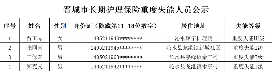 根据《长期护理失能等级评估标准(试行)》《晋城市长期护理保险失能评定管理办法(试行)》规定,经评定,贾玉琴、张同喜等4位同志符合重度失能标准,现予以公示。