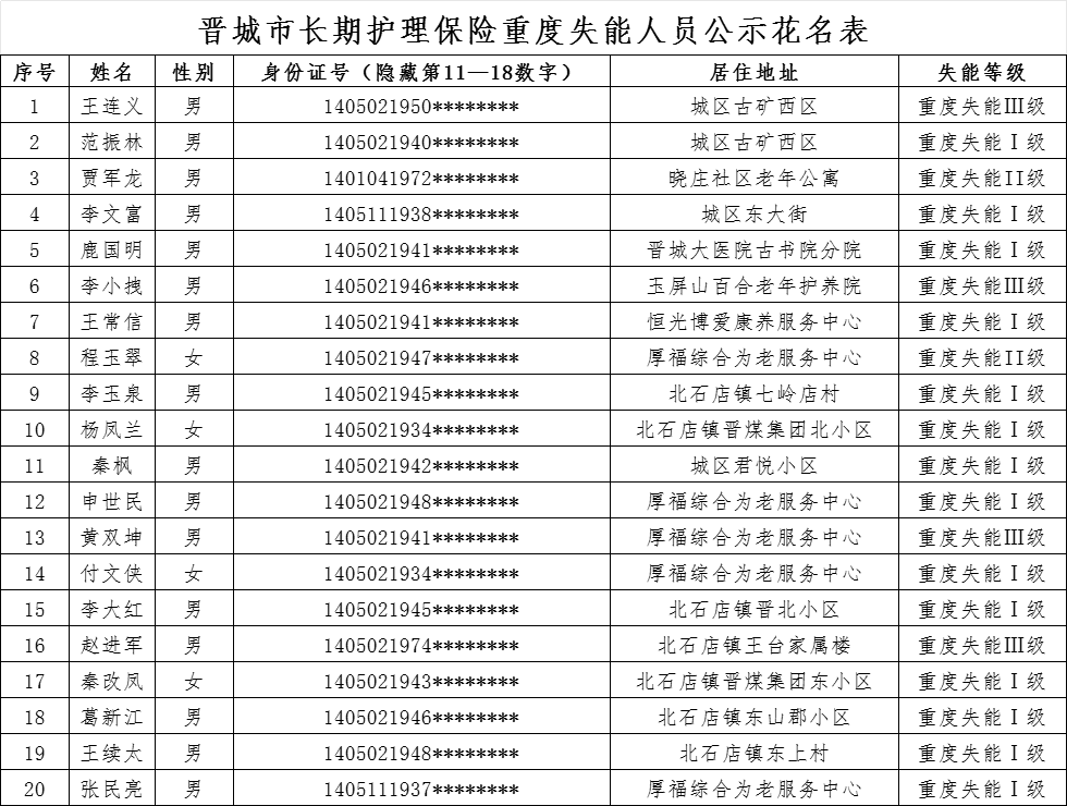根据《长期护理失能等级评估标准(试行)》《晋城市长期护理保险失能评定管理办法(试行)》规定,经评定,王连义、范振林等20位同志符合重度失能标准,现予以公示(详见附表)。