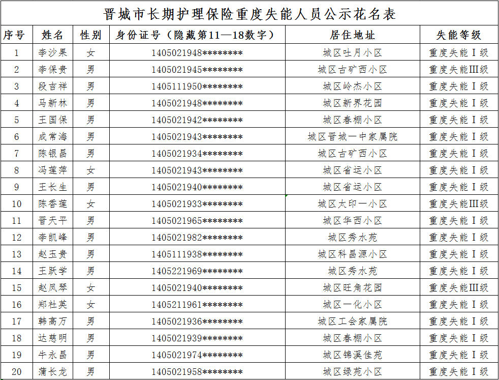根据《长期护理失能等级评估标准(试行)》《晋城市长期护理保险失能评定管理办法(试行)》规定,经评定,李沙果、李保贵等20位同志符合重度失能标准,现予以公示(详见附表)。
