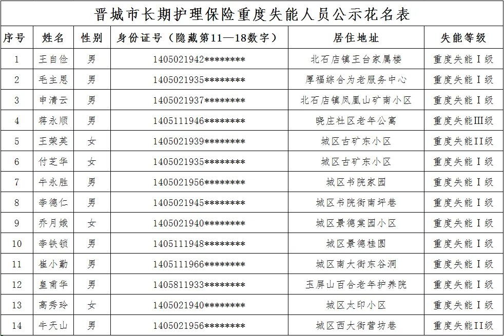 《晋城市长期护理保险重度失能人员公示》2025年第2044号