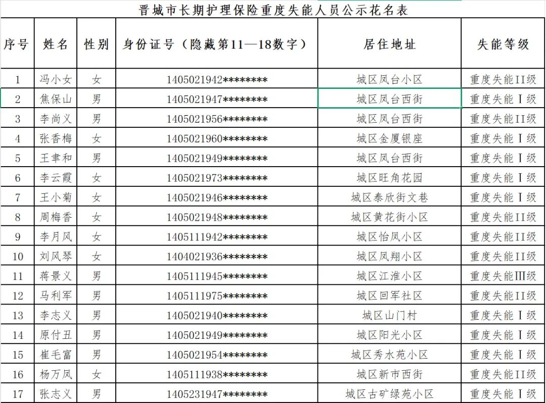 根据《长期护理失能等级评估标准(试行)》《晋城市长期护理保险失能评定管理办法(试行)》规定,经评定,冯小女、焦保山等17位同志符合重度失能标准,现予以公示(详见附表)。