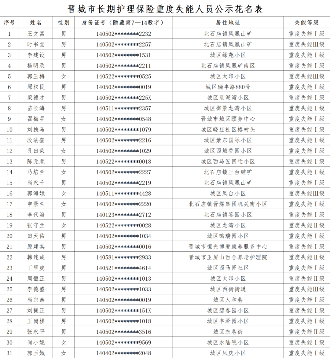 根据《长期护理失能等级评估标准(试行)》《晋城市长期护理保险失能评定管理办法(试行)》规定,经评定,王文富、时书堂等31位同志符合重度失能标准,现予以公示。