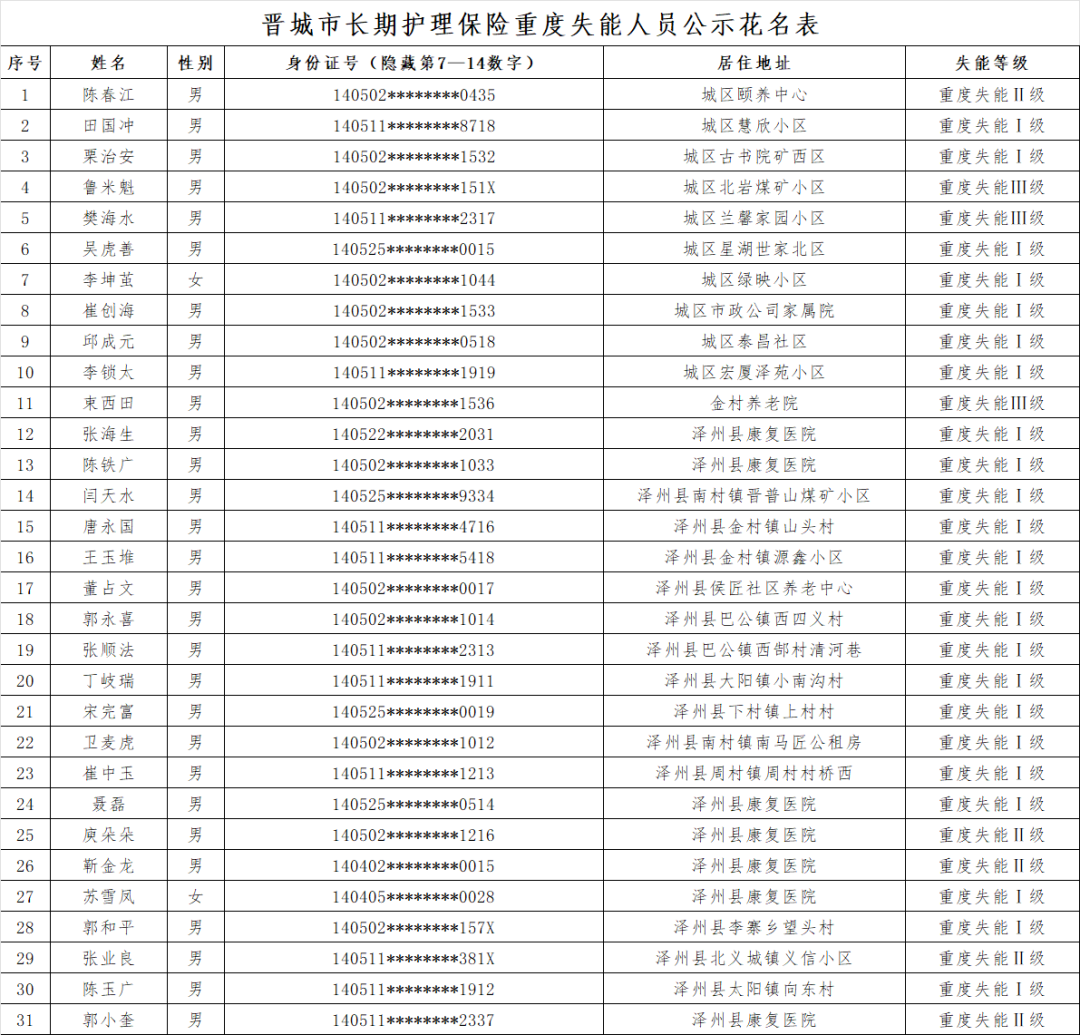 根据《长期护理失能等级评估标准(试行)》《晋城市长期护理保险失能评定管理办法(试行)》规定,经评定,陈春江、田国冲等31位同志符合重度失能标准,现予以公示。